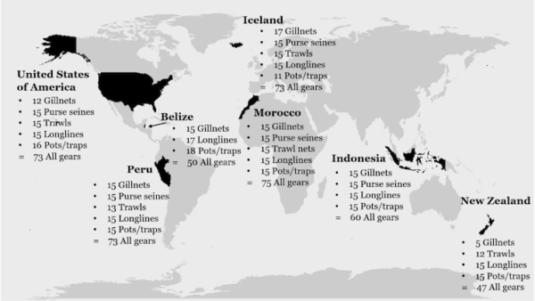 We surveyed fishers using five major gear types: gillnets, longlines, purse seine nets, trawl nets, and pots and traps.