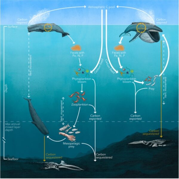 Image: Whales’ direct and indirect nutrient and carbon cycling pathways. Credit: Trends in Ecology & Evolution/Pearson