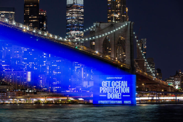 A message reads “Get Ocean Protection Done!”. Greenpeace USA activists project scenes onto New York’s Brooklyn Bridge on the eve of the IGC5 negotiations at the United Nations. Credit: POW / Greenpeace