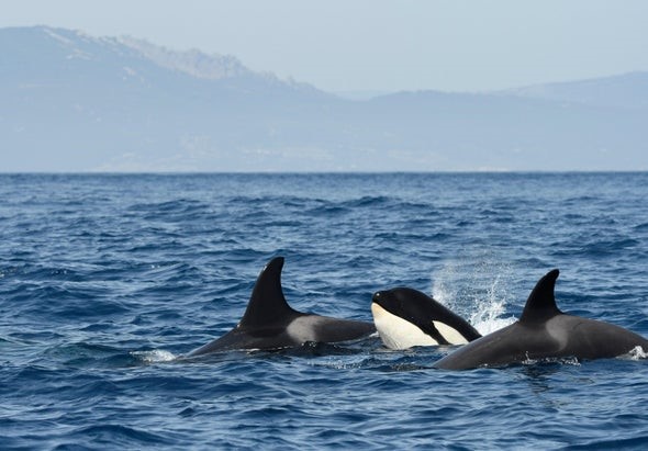A group of three orcas, also known as killer whales, are seen swimming in the Strait of Gibraltar. Individuals in the critically endangered subpopulation have been attacking boats off the coast of the Iberian Peninsula. Credit: Malcolm Schuyl/Alamy Stock Photo