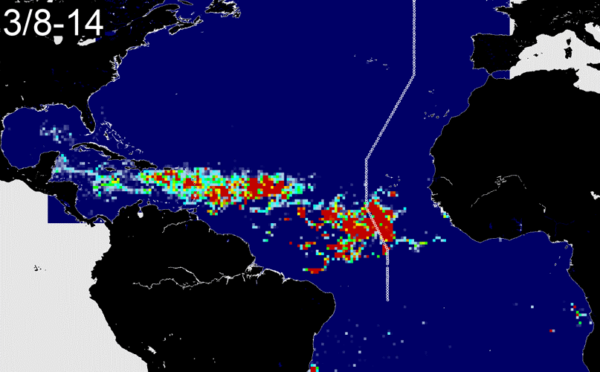 Sargassum coverage based on satellite data. The white circles indicate sampling locations on GO-SHIP line A16. (Image courtesy of C. Hu and B. Barnes)