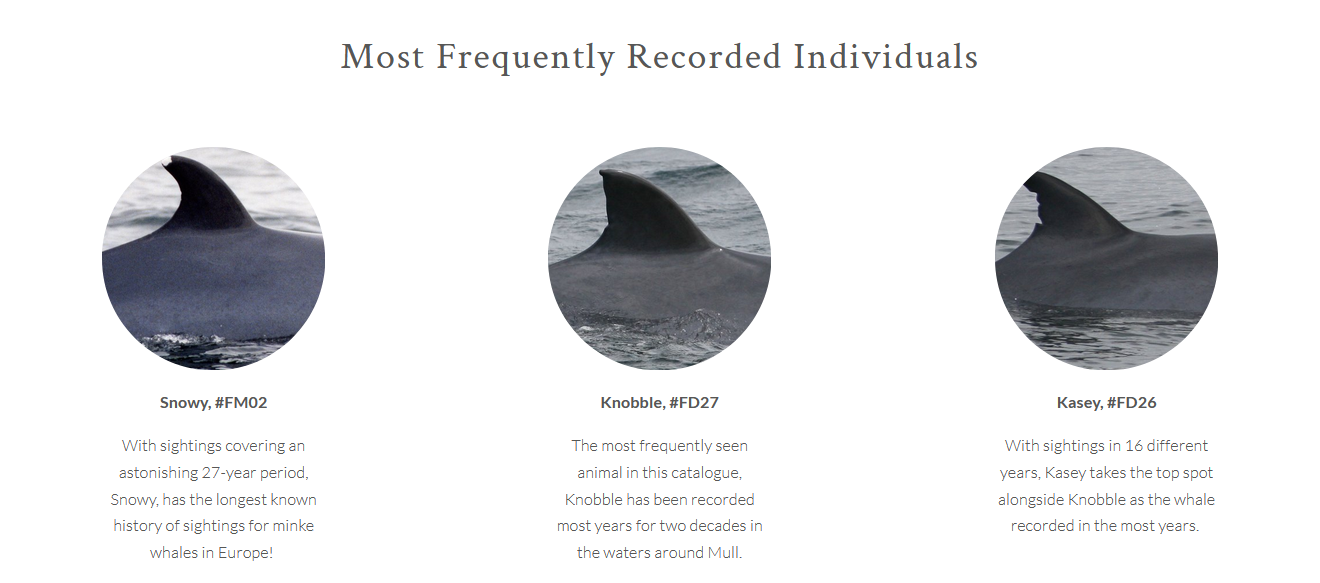 A minke whale named Snowy has visited the region over an astonishing 27-year period – the longest known history of sightings for this species in Europe. A whale known as Knobble holds the title for the most frequently recorded minke whale in the Hebrides, having been spotted more than 60 times since 2002, mostly in waters around the Isle of Mull.