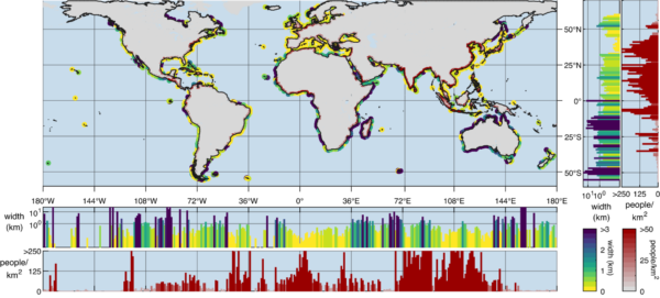 Infrastructure-free width is depicted in yellow-green-blue from 0 to 3 km. Coastal population density is depicted in white-red from 0 to 50 people/km2. Bar graphs show the latitudinal and longitudinal average.