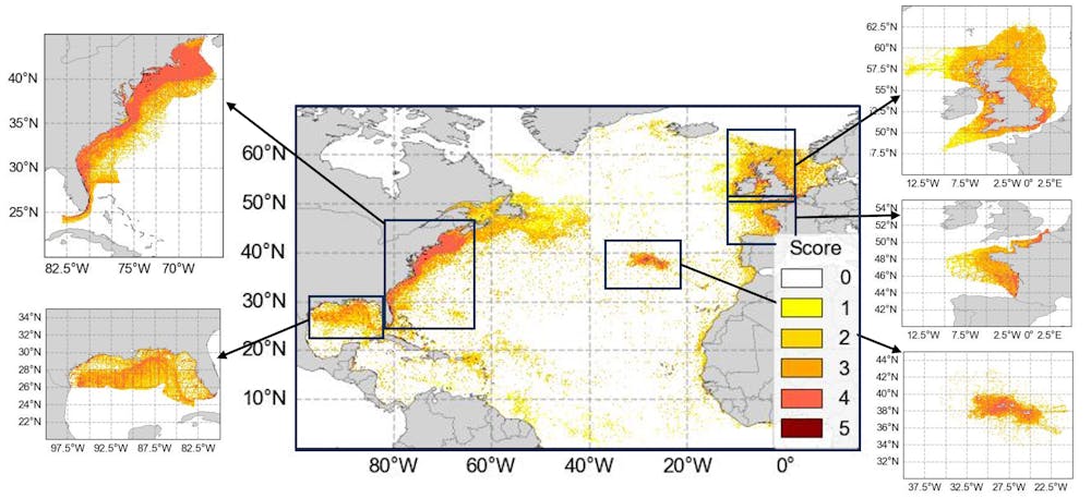 Map of plastic risk to marine megafauna and selected shallow water habitats in the North Atlantic, with zero to five designated as lowest to highest risk. The five areas of greatest risk have been highlighted.