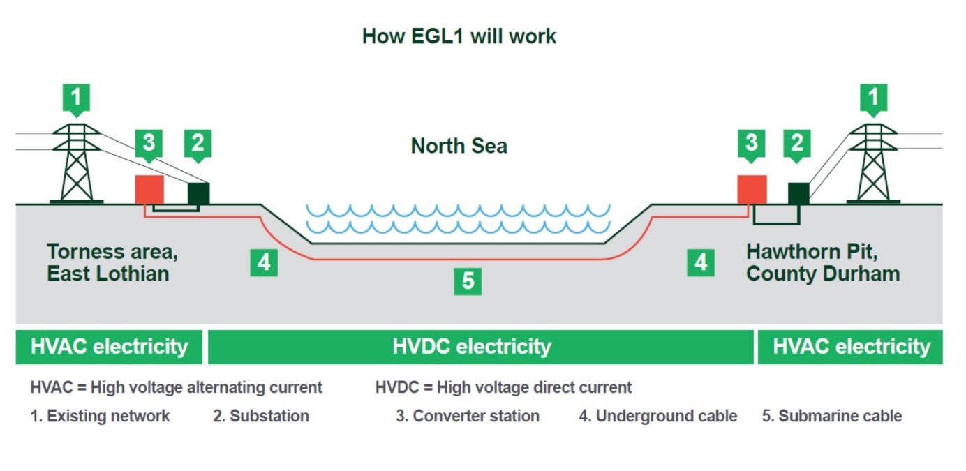 EGL1 is being developed by National Grid Electricity Transmission (NGET) and SP Transmission, part of SP Energy Networks. The vast majority of the 196km cable will be under the North Sea, with the remaining 20km of cables underground linking the cable to substations and converter stations in Torness, East Lothian and Hawthorn Pit, County Durham.