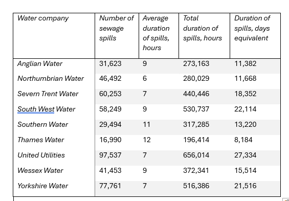 Table: How long did sewage spills last for in your area. Data for England, 2023. Source Environment Agency.