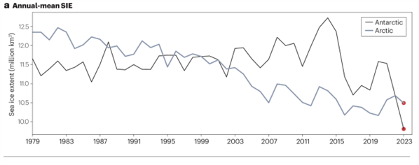 Authors of a paper in Nature Briefing report that global sea ice continues to decline as a result of anthropogenic forcing and internal variability. Although the long-term global trend was once dominated by sea ice reductions in the Arctic, rapid changes in the Antarctic are now exerting a strong influence. Based on the satellite record, Antarctic SIE was at a record low for much of the year in 2023, including wintertime SIE 5 SD below average, shifting the previously positive trend to negative.