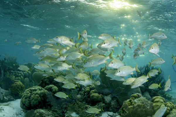Bluestriped grunts swim around a reef in Hol Chan Marine Reserve, Belize. Luciano Candisani /iLCP