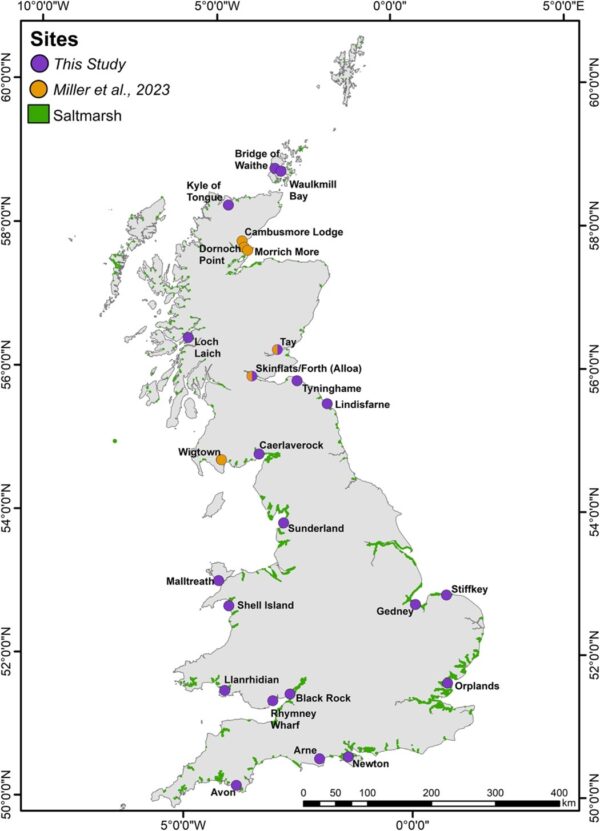British saltmarshes (in green) and sample sites (in purple). Smeaton et al (2023) / Marine Ecosystem Ecology