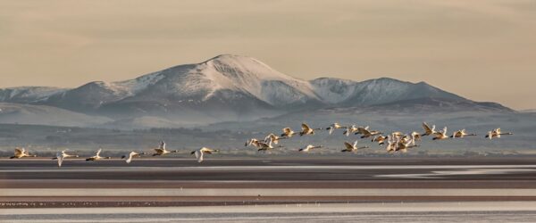 Swans fly above Caerlaverock saltmarsh, on the coast of Scotland. Photo: Caroline Legg / flickr