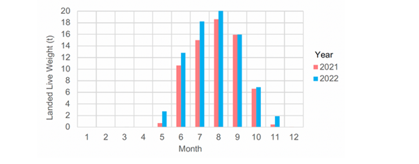 Total monthly landings (tonnes) reported for all wrasse species in 2021 and 2022 (Figure 2 from Scottish Government report (2024)