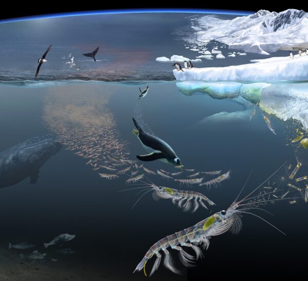 Illustration of krill in the Southern Ocean ecosystem. Artist: Glynn Gorick, reproduced from Hill et al. 2024 (https://doi.org/10.3389/fmars.2024.1307402)