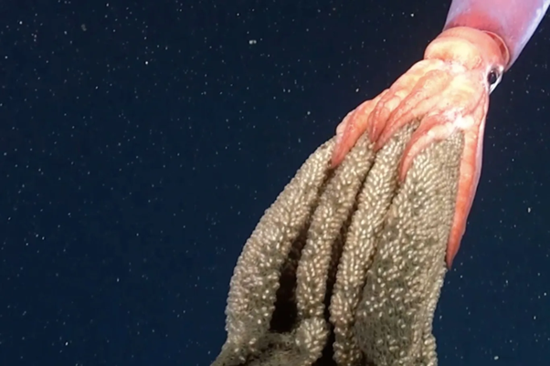 Deep-sea scientists were amazed by the rare sight of a mother squid carrying her eggs through the ocean, putting herself at risk to protect her offspring.