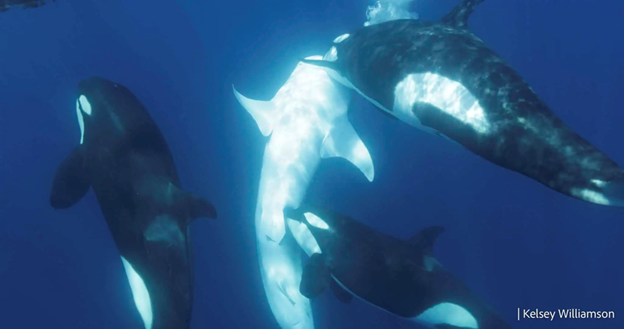 Orcas work together to bring the whale shark closer to the surface. Photo: Kelsey Williamson