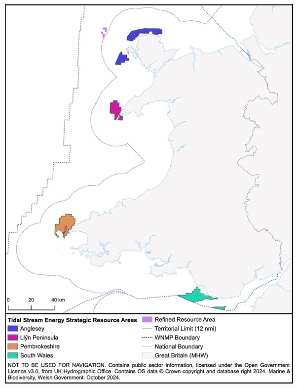Map: Refined Resource Area and Strategic Resource Areas for tidal stream energy. Source: Welsh Government