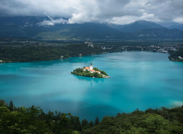 Photo description: Lake Bled surrounding Bled Island in Slovenia.The island has several buildings, the main one being the pilgrimage church dedicated to the Assumption of Mary. Photo by Niklas Jeromin / Pexels.