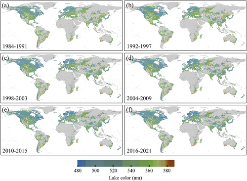 Image description: A figure showing the spatial distribution of global lake color during individual time periods from 1984 to 2021. Image from Shen et al. 2024.