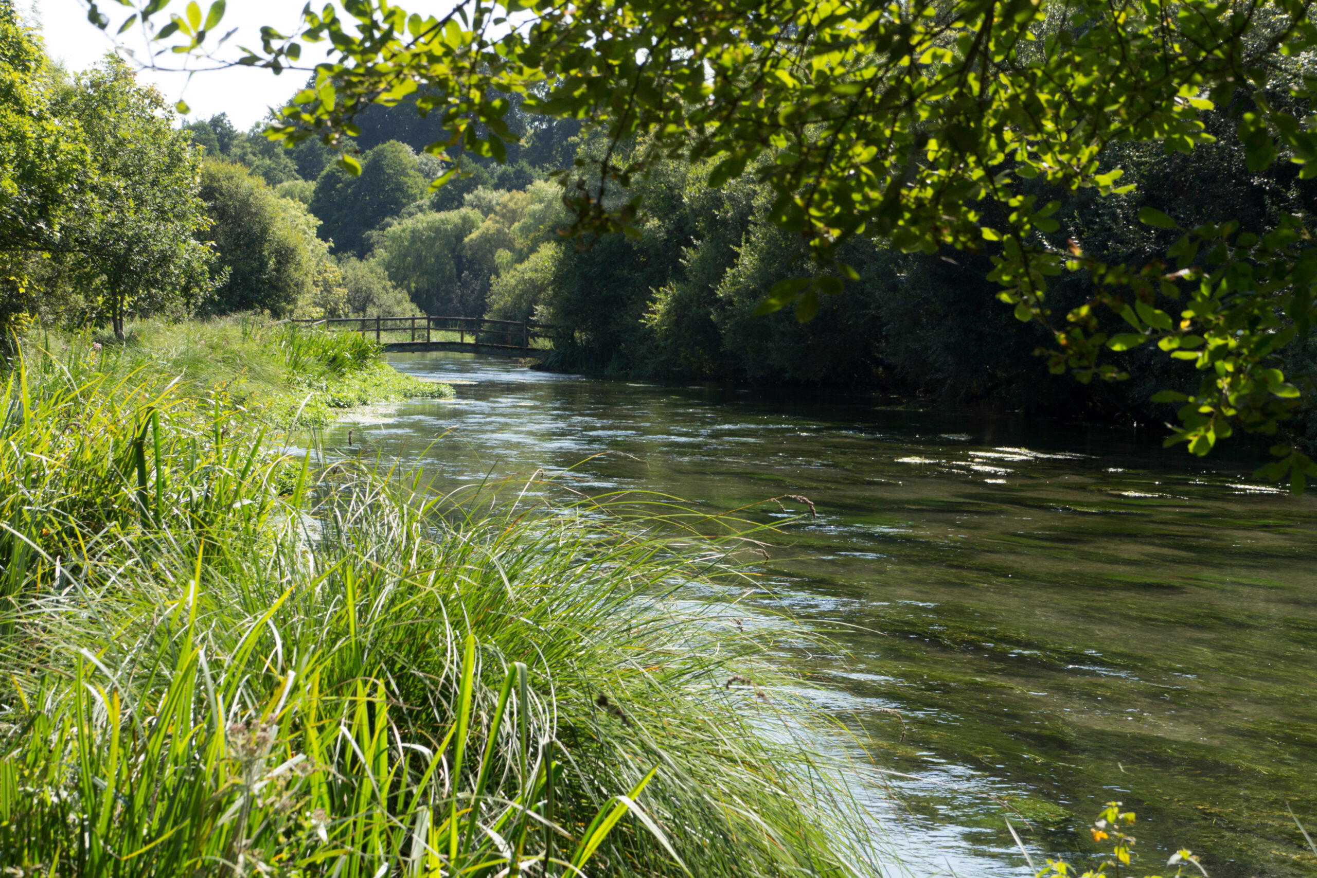 Image description: The River Itchen, a chalk stream that runs through Hampshire, bordered by grassy banks and lined with trees. Image by Philip Enticknap.