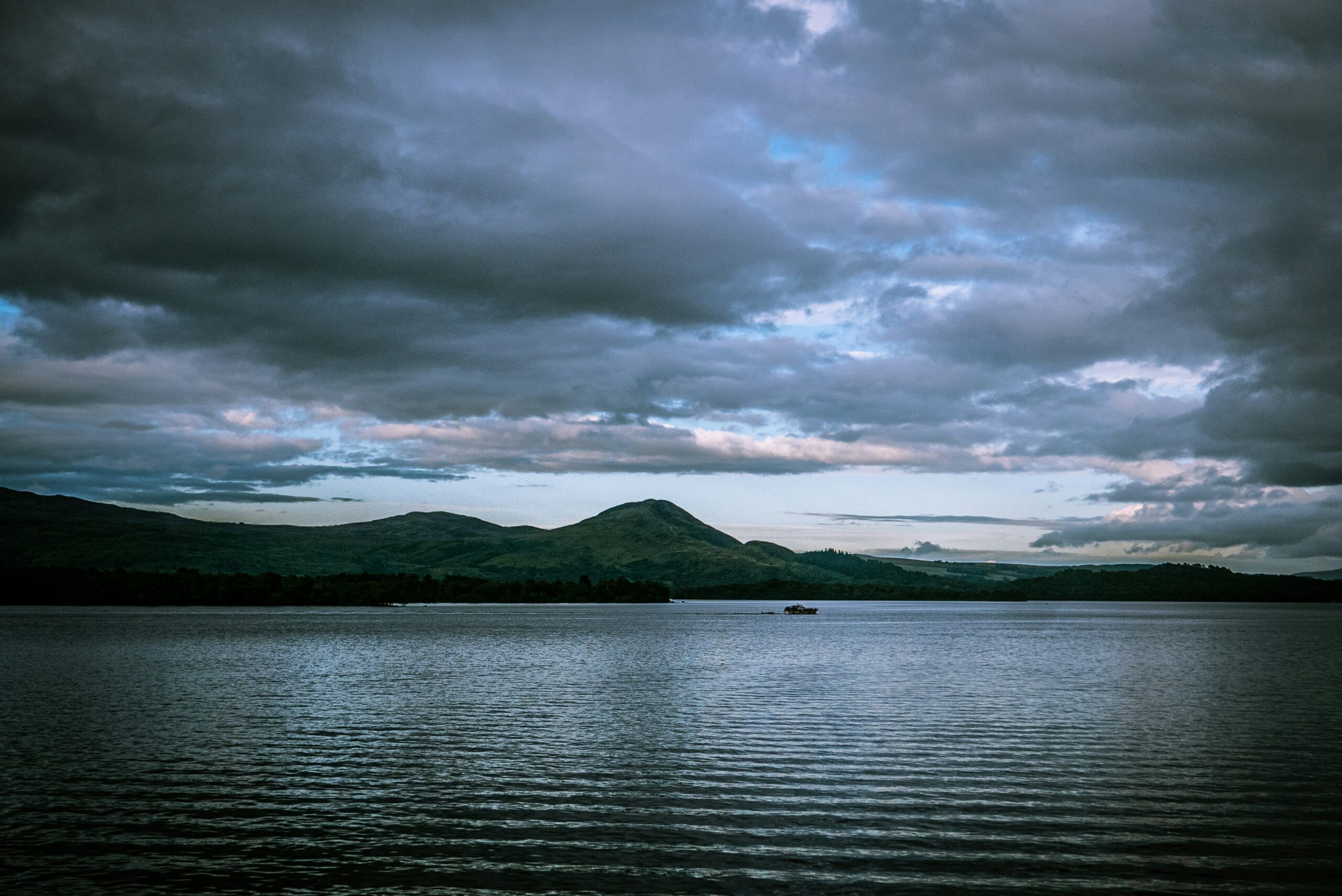 Image description: The dark waters of Loch Lomond in Scotland, with rolling hills in the background. Photo by M on Unsplash.